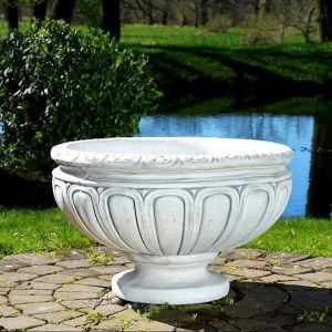 Donica w formie pucharu z kwiatowym wzorem to wyjątkowo elegancka dekoracja ogrodowa, wykonana z wysokiej klasy białego betonu, który charakteryzuje się dużą odpornością na różnorodne warunki atmosferyczne. Dzięki swojej solidnej konstrukcji, ta duża donica jest idealnym wyborem do przydomowych ogrodów, a także przestrzeni publicznych. Klasyczny wzór pucharu nadaje jej niepowtarzalny styl, który pasuje zarówno do nowoczesnych, jak i tradycyjnych aranżacji.