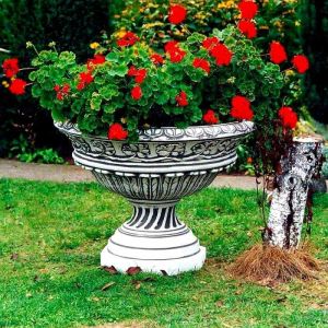 Jej masywny, kielichowaty kształt i subtelny kwiatowy wzór sprawiają, że donica przyciąga wzrok, stając się centralnym punktem dekoracyjnym w ogrodzie. Forma pucharu kojarzy się z tradycją i klasyką, co czyni ją idealnym wyborem dla tych, którzy cenią sobie ponadczasowy design. Dzięki temu donica może stać się ozdobą na lata, harmonijnie wpasowując się w każdą przestrzeń.